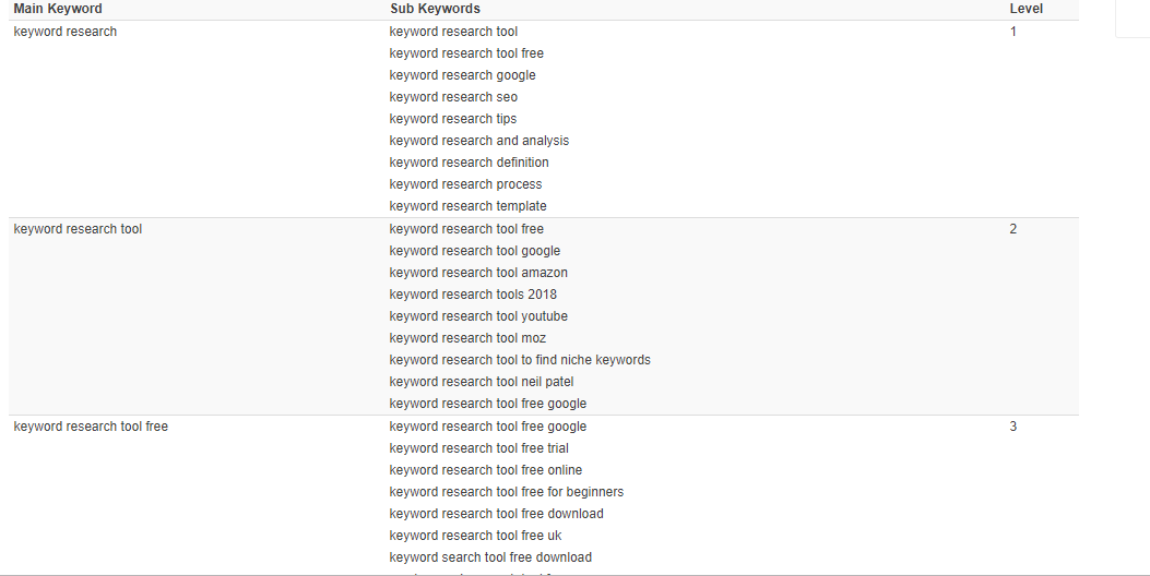 The most amazing feature of this tool is its three level approach. I have use the tool to see search terms for word “Keyword research”. The tools has showed me keyword ideas based on 3 different levels.