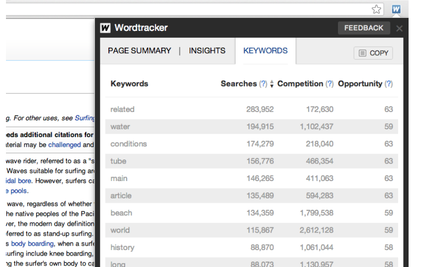 It’s pretty easy and simple to use. Just select an article and then click “w” button and the tool will scan the page for the keywords list.